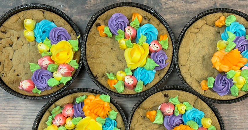 Our cookie cakes can be decorated similarly to our occasion cakes. Hand piped flowers, balloons, rosettes, sprinkles, toy toppers, edible images and many more designs can adorn any cookie cake. Our lead decorator and one of our owners, Hillary, along with her team, can personalize these cakes with a message or greeting to match your desired decoration.